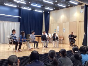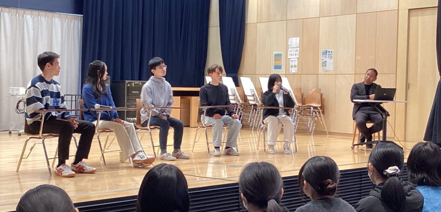5名の生徒からは、IBDPの学びを振り返って、日々の学習の大切さや他者に相談することの重要性、ルーティンの確立など、在校生がすぐにでも真似できる貴重な話を聞くことができました。一方で、経験した2期生にしかわからない進路選択の悩みや進路決定の方法なども語られ、在校生たちは熱心にメモをとりながら耳を傾けていました。