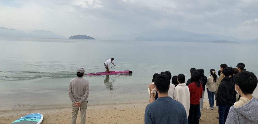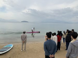 During the demonstration, Mr. Taguchi rode the same SUP board he uses in competition, allowing students to experience firsthand the impressive speed and power of elite-level racing.