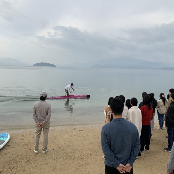 プロSUPレーサーの田口頼さんが来校され、デモンストレーションと講義を行っていただきました。 デモンストレーションでは、実際にレースで使用しているSUPに乗艇していただき、スピード感を拝見させていただきました。 また、講義では、2022年に行われたワールドツアーの動画を拝見しました。スタート直後に落水したにも関わらず、巻き返して優勝されていました。「(悪条件が重なっていたため)落水は想定通…